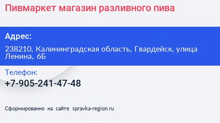 Пивмаркет, магазин разливного пива по адресу 238210, Калининградская область, Гвардейск, улица Ленина, 6Б в дальнейшем Организация, размещена в следующих категориях: