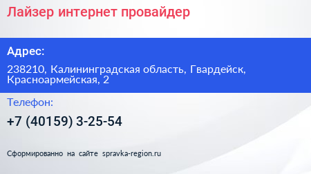 Лайзер, интернет-провайдер по адресу 238210, Калининградская область, Гвардейск, Красноармейская, 2 в дальнейшем Организация, размещена в следующих категориях: