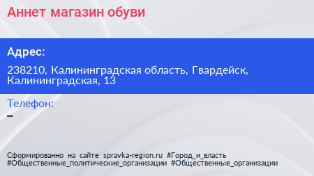 Аннет, магазин обуви по адресу 238210, Калининградская область, Гвардейск, Калининградская, 13 в дальнейшем Организация, размещена в следующих категориях: