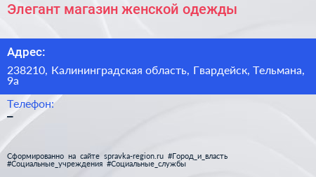 Элегант, магазин женской одежды по адресу 238210, Калининградская область, Гвардейск, Тельмана, 9а в дальнейшем Организация, размещена в следующих категориях: