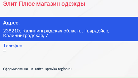 Элит-Плюс, магазин одежды по адресу 238210, Калининградская область, Гвардейск, Калининградская, 7 в дальнейшем Организация, размещена в следующих категориях: