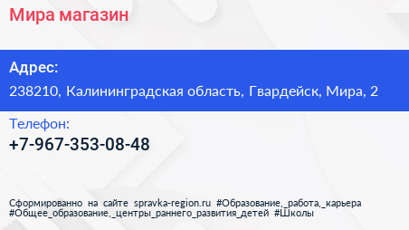 Мира, магазин по адресу 238210, Калининградская область, Гвардейск, Мира, 2 в дальнейшем Организация, размещена в следующих категориях: