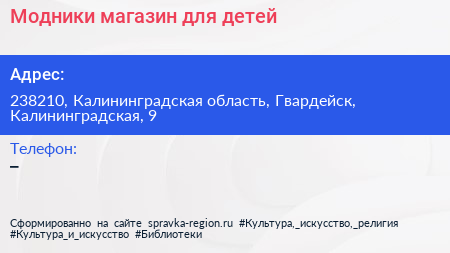 Модники, магазин для детей по адресу 238210, Калининградская область, Гвардейск, Калининградская, 9 в дальнейшем Организация, размещена в следующих категориях:
