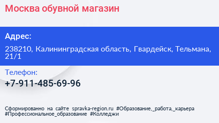 Москва, обувной магазин по адресу 238210, Калининградская область, Гвардейск, Тельмана, 21/1 в дальнейшем Организация, размещена в следующих категориях: