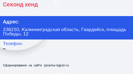 Секонд-хенд по адресу 238210, Калининградская область, Гвардейск, площадь Победы, 12 в дальнейшем Организация, размещена в следующих категориях: