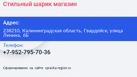 Стильный шарик, магазин по адресу 238210, Калининградская область, Гвардейск, улица Ленина, 6Б в дальнейшем Организация, размещена в следующих категориях: