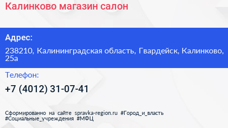Калинково, магазин-салон по адресу 238210, Калининградская область, Гвардейск, Калинково, 25а в дальнейшем Организация, размещена в следующих категориях: