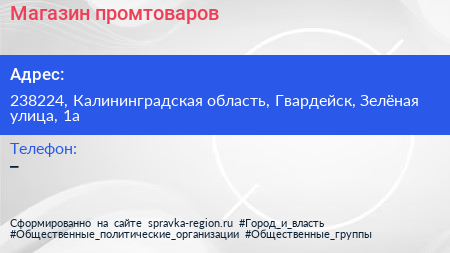 Магазин промтоваров по адресу 238224, Калининградская область, Гвардейск, Зелёная улица, 1а в дальнейшем Организация, размещена в следующих категориях: