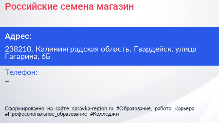 Российские семена, магазин по адресу 238210, Калининградская область, Гвардейск, улица Гагарина, 6Б в дальнейшем Организация, размещена в следующих категориях: