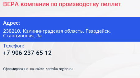 ВЕРА, компания по производству пеллет по адресу 238210, Калининградская область, Гвардейск, Станционная, 3а в дальнейшем Организация, размещена в следующих категориях: