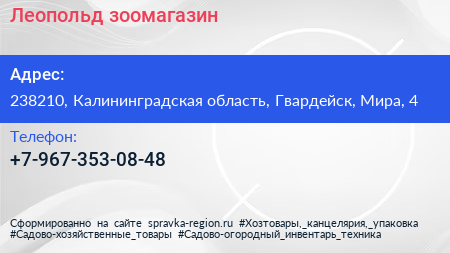Леопольд, зоомагазин по адресу 238210, Калининградская область, Гвардейск, Мира, 4 в дальнейшем Организация, размещена в следующих категориях: