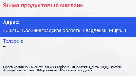 Яшма, продуктовый магазин по адресу 238210, Калининградская область, Гвардейск, Мира, 4 в дальнейшем Организация, размещена в следующих категориях: