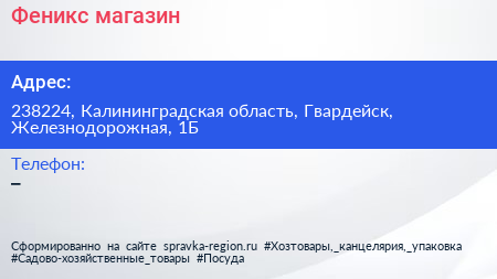 Феникс, магазин по адресу 238224, Калининградская область, Гвардейск, Железнодорожная, 1Б в дальнейшем Организация, размещена в следующих категориях: