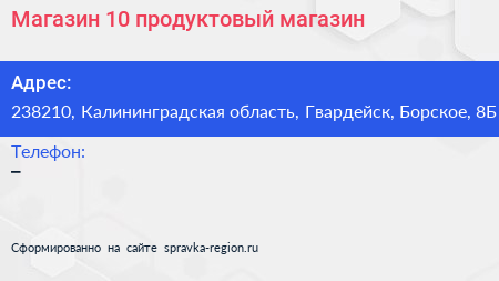 Магазин №10, продуктовый магазин по адресу 238210, Калининградская область, Гвардейск, Борское, 8Б в дальнейшем Организация, размещена в следующих категориях: