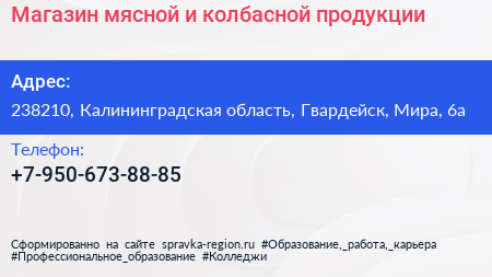 Магазин мясной и колбасной продукции по адресу 238210, Калининградская область, Гвардейск, Мира, 6а в дальнейшем Организация, размещена в следующих категориях: