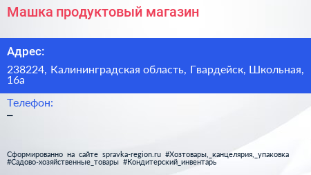 Машка, продуктовый магазин по адресу 238224, Калининградская область, Гвардейск, Школьная, 16а в дальнейшем Организация, размещена в следующих категориях: