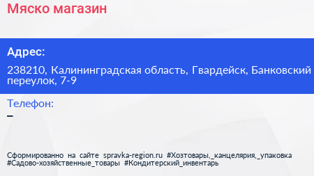 Мяско, магазин по адресу 238210, Калининградская область, Гвардейск, Банковский переулок, 7-9 в дальнейшем Организация, размещена в следующих категориях: