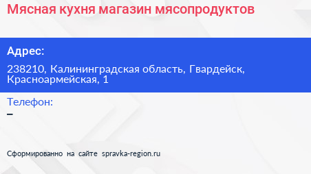 Мясная кухня, магазин мясопродуктов по адресу 238210, Калининградская область, Гвардейск, Красноармейская, 1 в дальнейшем Организация, размещена в следующих категориях: