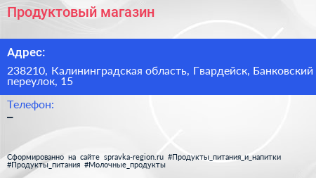 Продуктовый магазин по адресу 238210, Калининградская область, Гвардейск, Банковский переулок, 15 в дальнейшем Организация, размещена в следующих категориях: