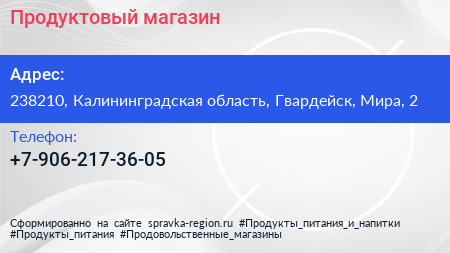 Продуктовый магазин по адресу 238210, Калининградская область, Гвардейск, Мира, 2 в дальнейшем Организация, размещена в следующих категориях: