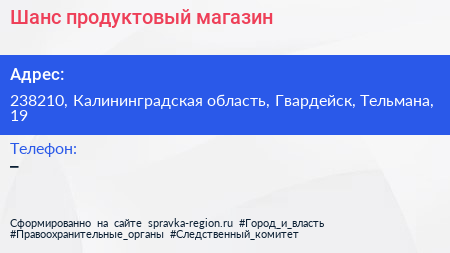 Шанс, продуктовый магазин по адресу 238210, Калининградская область, Гвардейск, Тельмана, 19 в дальнейшем Организация, размещена в следующих категориях: