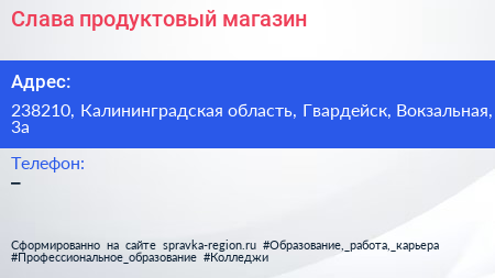 Слава, продуктовый магазин по адресу 238210, Калининградская область, Гвардейск, Вокзальная, 3а в дальнейшем Организация, размещена в следующих категориях: