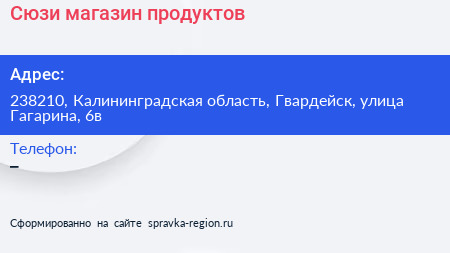 Сюзи, магазин продуктов по адресу 238210, Калининградская область, Гвардейск, улица Гагарина, 6в в дальнейшем Организация, размещена в следующих категориях: