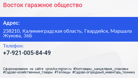 Восток, гаражное общество по адресу 238210, Калининградская область, Гвардейск, Маршала Жукова, 36Б в дальнейшем Организация, размещена в следующих категориях: