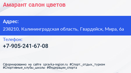 Амарант, салон цветов по адресу 238210, Калининградская область, Гвардейск, Мира, 6а в дальнейшем Организация, размещена в следующих категориях: