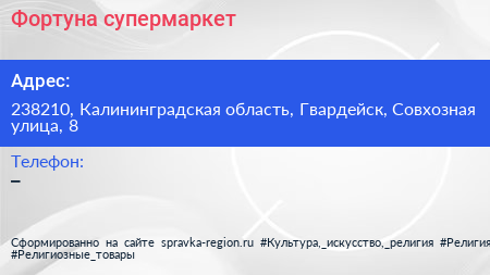 Фортуна, супермаркет по адресу 238210, Калининградская область, Гвардейск, Совхозная улица, 8 в дальнейшем Организация, размещена в следующих категориях: