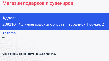 Магазин подарков и сувениров по адресу 238210, Калининградская область, Гвардейск, Горная, 2 в дальнейшем Организация, размещена в следующих категориях: