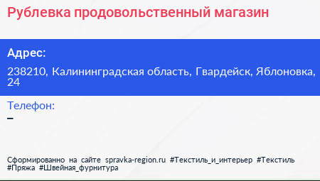 Рублевка, продовольственный магазин по адресу 238210, Калининградская область, Гвардейск, Яблоновка, 24 в дальнейшем Организация, размещена в следующих категориях: