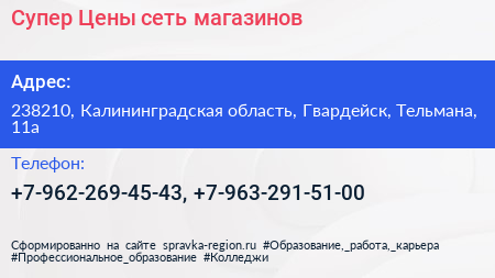 Супер Цены, сеть магазинов по адресу 238210, Калининградская область, Гвардейск, Тельмана, 11а в дальнейшем Организация, размещена в следующих категориях: