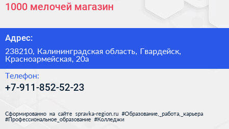 1000 мелочей, магазин по адресу 238210, Калининградская область, Гвардейск, Красноармейская, 20а в дальнейшем Организация, размещена в следующих категориях: