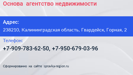 Основа+, агентство недвижимости по адресу 238210, Калининградская область, Гвардейск, Горная, 2 в дальнейшем Организация, размещена в следующих категориях: