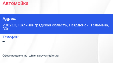 Автомойка по адресу 238210, Калининградская область, Гвардейск, Тельмана, 30г в дальнейшем Организация, размещена в следующих категориях: