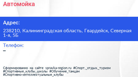Автомойка по адресу 238210, Калининградская область, Гвардейск, Северная 1-я, 5Б в дальнейшем Организация, размещена в следующих категориях: