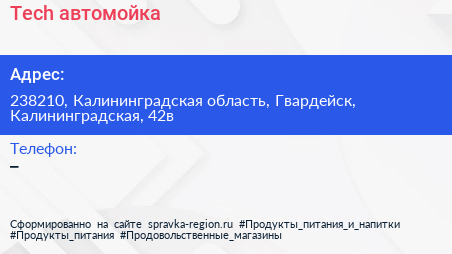 Tech, автомойка по адресу 238210, Калининградская область, Гвардейск, Калининградская, 42в в дальнейшем Организация, размещена в следующих категориях: