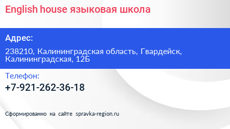 English house, языковая школа по адресу 238210, Калининградская область, Гвардейск, Калининградская, 12Б в дальнейшем Организация, размещена в следующих категориях: