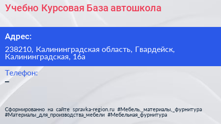 Учебно Курсовая База, автошкола по адресу 238210, Калининградская область, Гвардейск, Калининградская, 16а в дальнейшем Организация, размещена в следующих категориях: