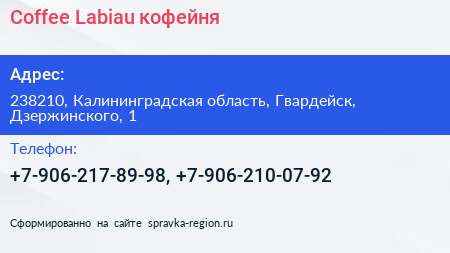 Coffee-Labiau, кофейня по адресу 238210, Калининградская область, Гвардейск, Дзержинского, 1 в дальнейшем Организация, размещена в следующих категориях: