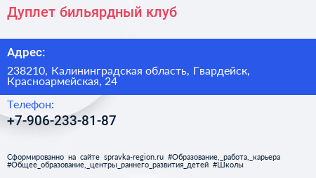 Дуплет, бильярдный клуб по адресу 238210, Калининградская область, Гвардейск, Красноармейская, 24 в дальнейшем Организация, размещена в следующих категориях: