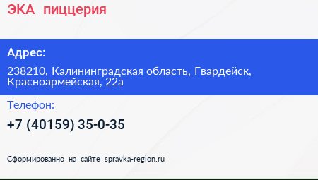ЭКА+, пиццерия по адресу 238210, Калининградская область, Гвардейск, Красноармейская, 22а в дальнейшем Организация, размещена в следующих категориях: