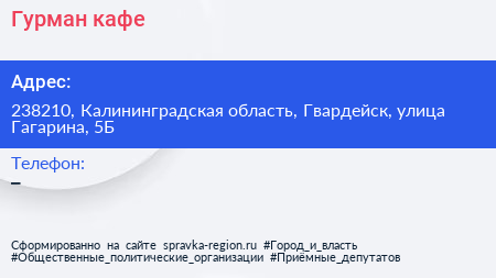 Гурман, кафе по адресу 238210, Калининградская область, Гвардейск, улица Гагарина, 5Б в дальнейшем Организация, размещена в следующих категориях: