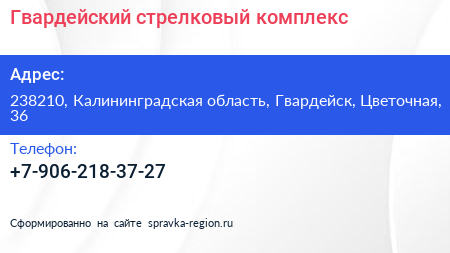 Гвардейский, стрелковый комплекс по адресу 238210, Калининградская область, Гвардейск, Цветочная, 36 в дальнейшем Организация, размещена в следующих категориях: