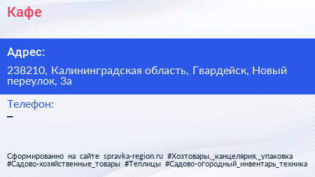 Кафе по адресу 238210, Калининградская область, Гвардейск, Новый переулок, 3а в дальнейшем Организация, размещена в следующих категориях: