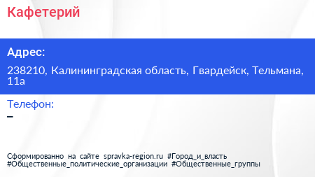Кафетерий по адресу 238210, Калининградская область, Гвардейск, Тельмана, 11а в дальнейшем Организация, размещена в следующих категориях: