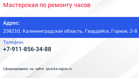 Мастерская по ремонту часов по адресу 238210, Калининградская область, Гвардейск, Горная, 2-8 в дальнейшем Организация, размещена в следующих категориях: