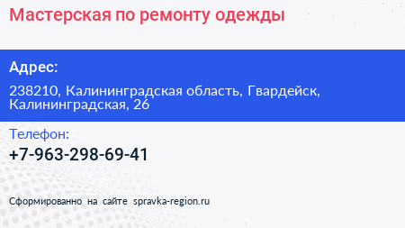 Мастерская по ремонту одежды по адресу 238210, Калининградская область, Гвардейск, Калининградская, 26 в дальнейшем Организация, размещена в следующих категориях:
