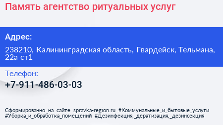 Память, агентство ритуальных услуг по адресу 238210, Калининградская область, Гвардейск, Тельмана, 22а ст1 в дальнейшем Организация, размещена в следующих категориях: